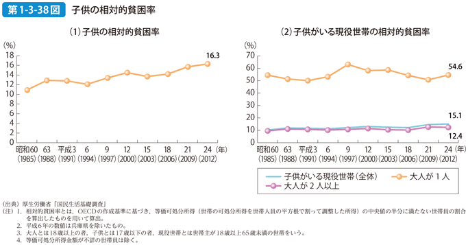内閣府の平成27年の資料を見ると、子供の相対的貧困率は1990年代半ば頃からおおむね上昇傾向にあることもわかります。なお、子供がいる現役世帯の相対的貧困率は15.1%であり、そのうち,ひとり親世帯の相対的貧困率は54.6%と、大人が2人以上いる世帯に比べて高い水準となっていることも伺えます。