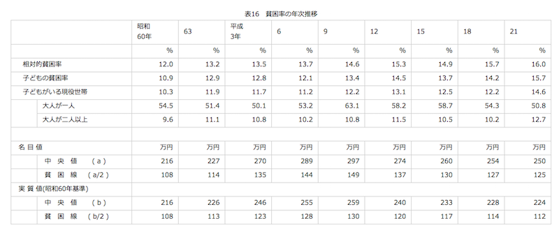 上記は少し古いデータですが、平成21年度の日本の所得の中央値が250万円なので、125万円以下で生活している人が貧困ラインを下回っているということです。