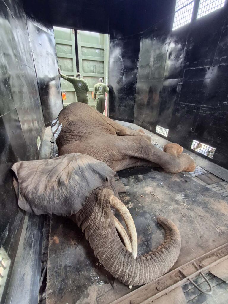 麻酔薬の影響が残っているといけないので、鉄格子越しにリバース剤を追加するが、一刻も早くリリースサイトにたどり着くようにトラックを出発させた。クレート内では6tの動物の対処などできないから、できるだけ早くクレートの外に出さないといけない。
