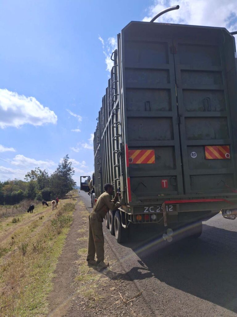ムエア国立公園からアバディア国立公園までの道のりは車で3時間ほどかかる。リバース剤(※2)を打たれ麻酔から覚めた57頭のゾウたちは、6m近い高さのトラックにファミリー単位で載せて、一度に移動する。トラックのクレート(ゾウを入れる荷台車)は前後のコンパートメントに分かれていて、母親と子どもは一緒のコンパートメントに入れる。