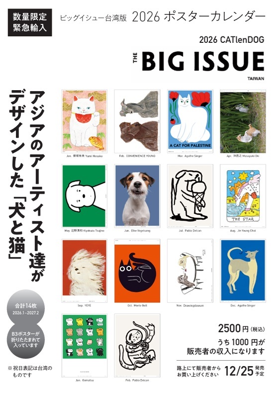 例えば「ビッグイシュー台湾」では毎年、年末に14人のアーティストが参加するポスタータイプのカレンダーを販売する。2026年版のカレンダーは特に売れ行きが良く、発売1週間で1万冊を超える販売数を記録したという。このカレンダーには、日本や韓国のアーティストも参加しており、ビッグイシュー台湾からの「ビッグイシュー日本と韓国でも販売しませんか?」という提案を受け、急遽、日本では台湾からの輸入販売を決定、韓国でも発売に向けて協議中だという。