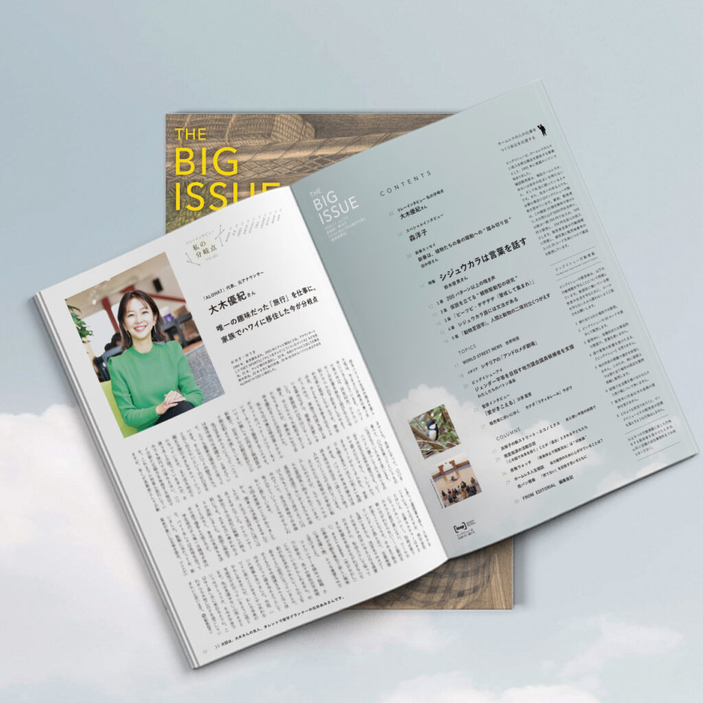 2026年1月1日発売の『ビッグイシュー日本版』の表紙は「森洋子」、特集は「シジュウカラは言葉を話す」です。